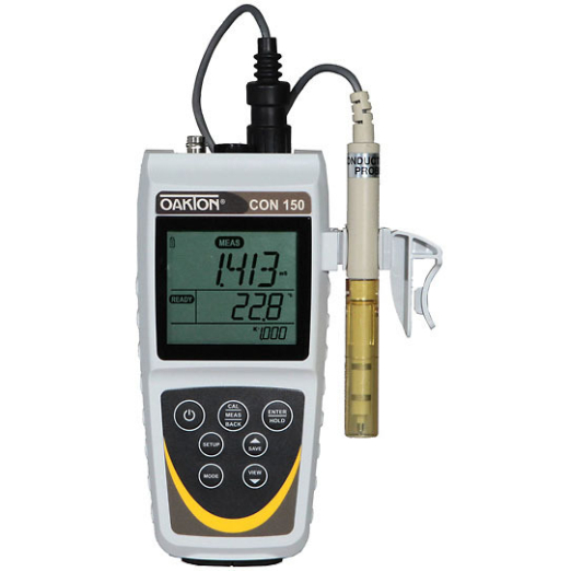 The CON 150 meter offers a rugged, waterproof housing with built-in stand at an economical price. The large, three-line LCD lets you view the conductivity or TDS measurement simultaneously with temperature. Convenient auto-ranging and auto-cal functions for one calibration point per measurement range. Select a two-cell probe with a 0.1, 1.0, or 10 cell constant and automatic temperature compensation (ATC). ATC ensures measurement accuracy even in fluctuating temperatures. Select temperature readout from C/F to suit your application.