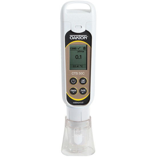 The Oakton CTSTestr 50C is a 3-in-1 meter that measures conductivity, TDS, and salinity accurately and quickly. It features a leakproof cap that doubles as a sample cup and base for hands-free use. With automatic temperature compensation and a large, easy-to-read display, it ensures precise readings. The waterproof design includes lanyard compatibility, making it ideal for various industries like water testing, agriculture, and more.