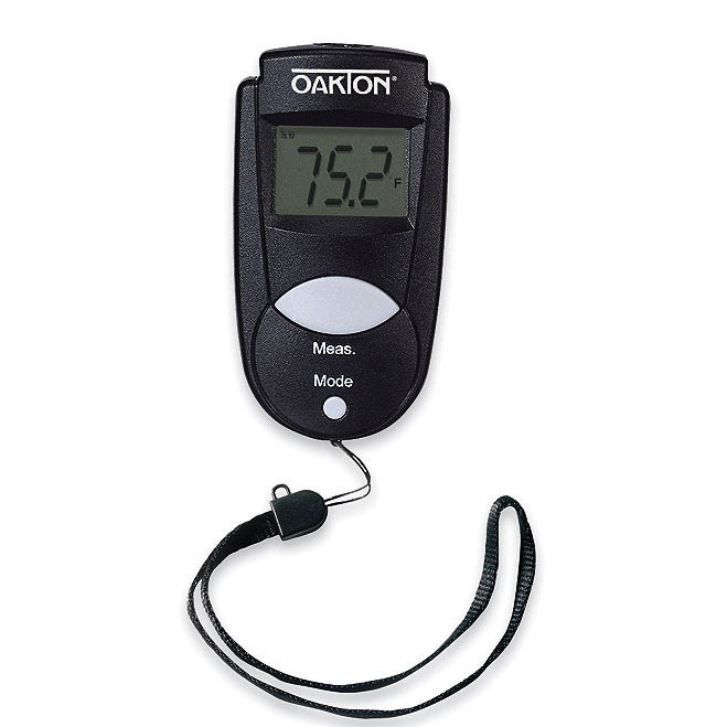 This pocket-size infrared thermometer takes surface temperature readings of any liquid, solid, or semi-solid in less than one second. Operation is simple; turn it on, point at sample, and take reading. Noncontact temperature measurements are ideal for food preparation, field use, and for mechanical maintenance and troubleshooting. Features include switchable °F/°C display, Hold function, selectable auto-off, minimum/maximum memory readings, adjustable emmissivity, wrist strap, flip-open stand, metal carrying case and soft touch keypad. -33 to 220°C (-27 to 428°F)