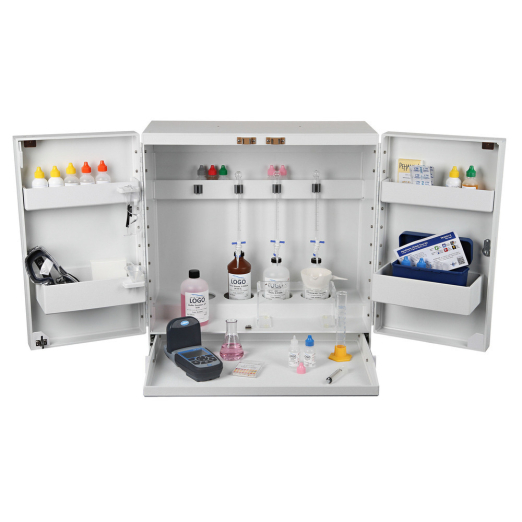 Plastic test station cabinets are a great way to save counter space and better organize a QC titration area. This wall mountable cabinet features a slide out work tray, 4 shelves, places for 4 burets and a light. Measurements: 25" wide x 25" tall x 12" deep. Slide out tray is 16" deep.