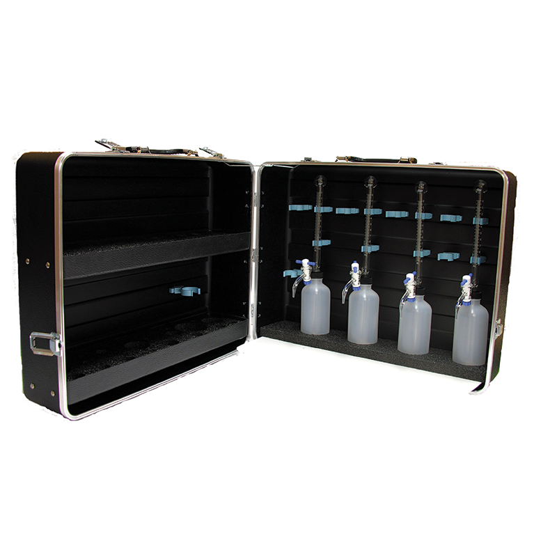 This self-contained titration case can hold up to 4 x 10 mL short form burets (not included) and can be positioned on the right or left-hand sides. Reagent trays can also be added for the convenience of storing items like reagent bottles and other testing apparatus. Clip orientation can be set to fit your testing needs and empty gaps can be used to store other items. Please contact the APS custom kitting/quoting team for more options.