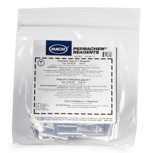 For presence/absence detection of glycols by visual test kit. Replacement reagent for Hach Glycol Detection Test Kit - 2186400. Pack of 25 Powder Pillows.