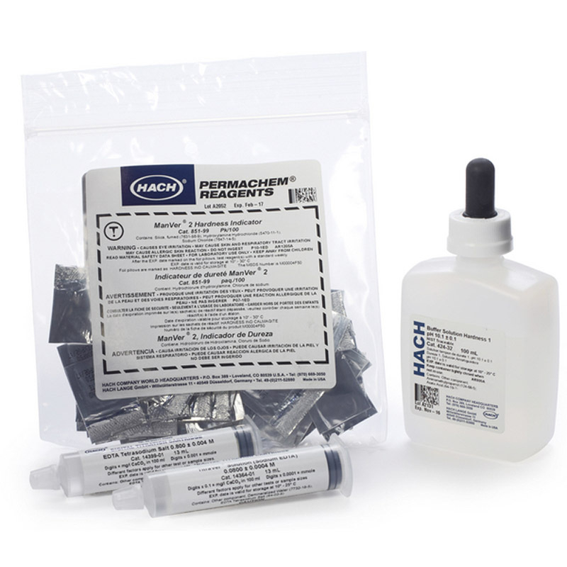 For Total Hardness determination by EDTA Digital Titrator titration with Calmagite indicator. Range: 10-160 and 100-4000 mg/L as CaCO3. Set contains ManVerĀ® 2 Indicator, Hardness 1 Buffer Solution and one cartridge each of 0.0800 M and 0.800 M EDTA.