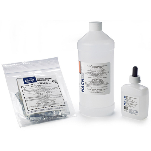 Reagent set for the determination of Total Hardness by the ManVerĀ® 2 Buret Titration Method (Hach method 8226). EPA Accepted method. Range: 0-2,500 mg/L as CaCO3. Contains: Buffer Solution (Hardness 1), ManVerĀ® 2 Hardness Indicator Powder Pillows and 0.0200 N EDTA (TitraVerĀ®) Titrant for up to approximately 100 tests.