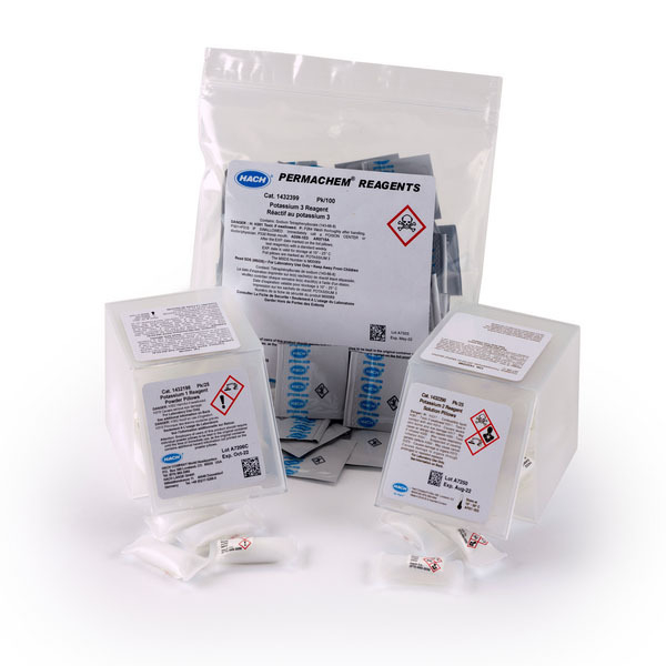 Reagent Set for determination of Potassium by the Tetraphenylborate method. Hach Method 8049. Range: 0.1 - 7.0 mg/L K. Set includes: Potassium 1 Reagent Powder Pillows, Potassium 2 Reagent Powder Pillows and Potassium 3 Reagent Powder Pillows for 100 tests.