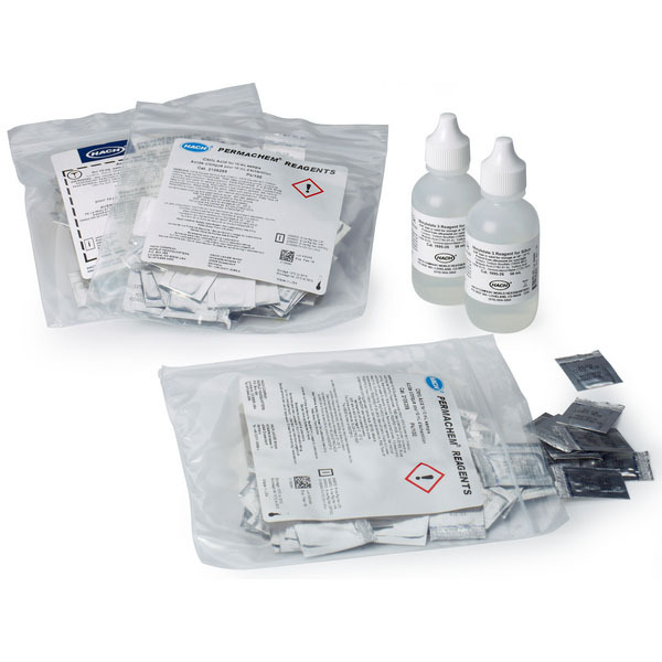 For determination of Low Range Silica by the Heteropoly Blue method. Hach Method 8186. Range: 0.01 - 1.60 mg/L SiO2. Sample Size: 10 mL. Reagent Set includes Amino Acid F Reagent Powder Pillows, Citric Acid Powder Pillows and Molybdate 3 Reagent Solution for about 100 tests.