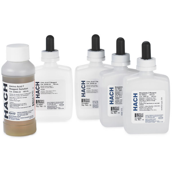 For determination of ultra-low range Silica by the Heteropoly Blue Method. Hach Method 8282. Range: 3 - 1000 µg/L as SiO2 Reagent set includes: Molybdate 3, Citric Acid F Solution and Amino Acid F solution for approximately 100 tests.
