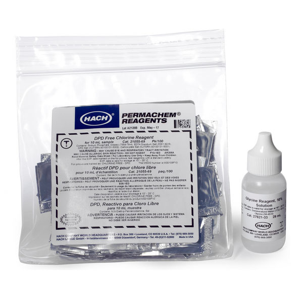 For determination of Chiorine Dioxide by the DPD Glycine method. USEPA accepted for reporting for drinking water analysis using Hach Method 10126. Range: 0.04 - 5.00 mg/L ClO?. Sample Size: 10 mL Reagent set includes DPD Free Chlorine Reagent Powder Pillows and Glycine Reagent for approximately 100 tests.