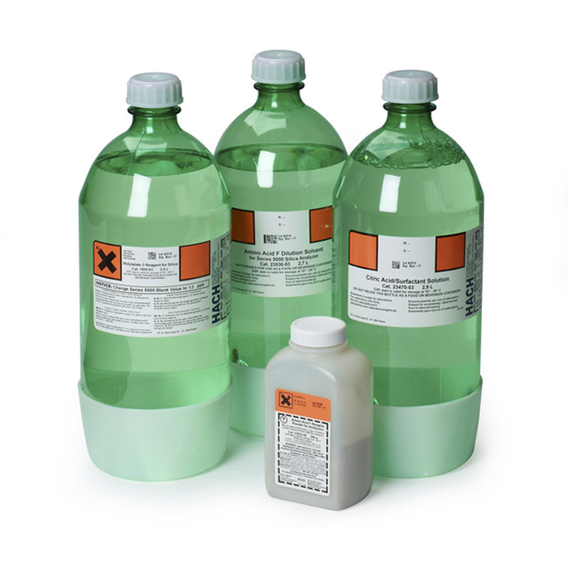 Series 5000 Silica Analyzer Reagent Set. Contains Molybdate 3 Reagent (2.9 L), Citric Acid/Surfactant Reagent (2.9 L), and Amino Acid F Reagent (2.9 L).