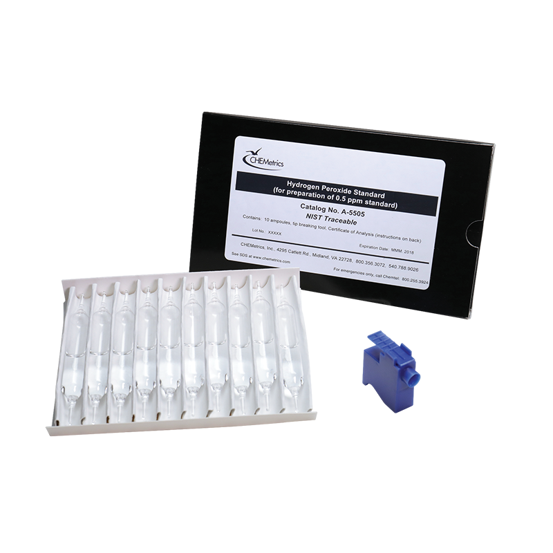Ensure accurate and reliable hydrogen peroxide testing with the CHEMetrics® Hydrogen Peroxide Standard (A-5505). This NIST-traceable standard offers a simple, fast method to verify the performance of test kits and instruments. Each pack includes 10 double-tipped ampoules, a tip-breaking tool, and a Certificate of Analysis. Prepare a 0.5 ppm standard by diluting to 100 mL—stable for 24 hours when stored in the dark at room temperature.