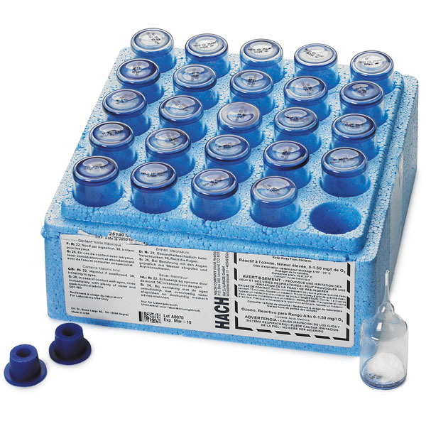 For determination of Ozone by the Indigo method, using AccuVacĀ® Ampules. Hach method 8311. Range: 0.01 - 1.50 mg/L O?. Pack of 25 ampules.