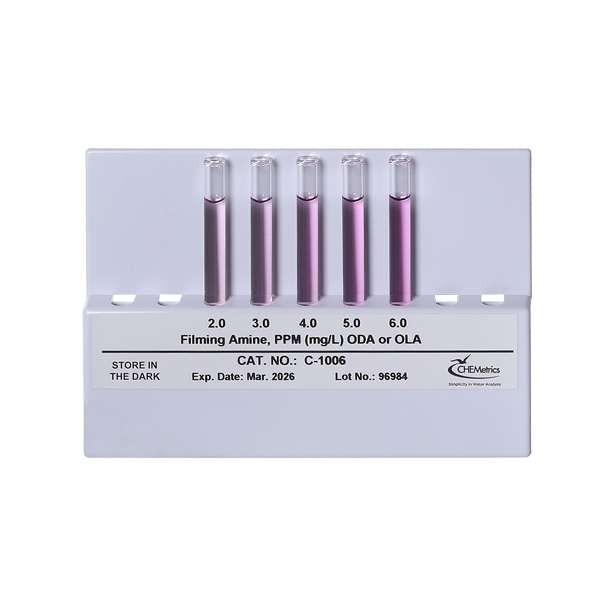 The kit's range is applicable for routine measurement of residual filming amines in boiler feedwater. The comparator contains a set of color standards (sealed ampoules) containing dye mixtures that are formulated to match the colors produced by the test ampoules. The color standards are pink in color and cover a range of 2-6 ppm octadecylamine (ODA).