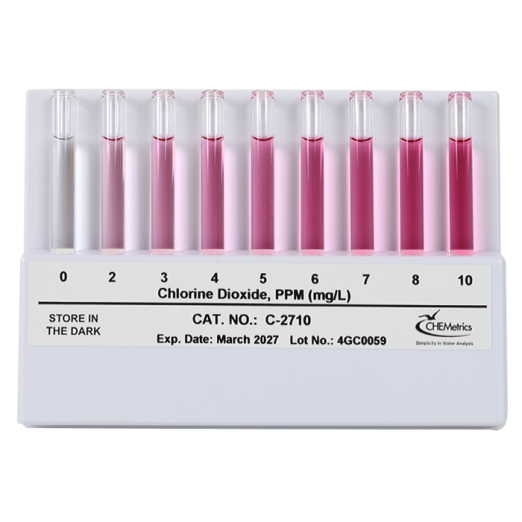 C-2710 High Range Chlorine Dioxide Comparator is a component of K-2705 Chlorine Dioxide CHEMets Visual Test Kit and is designed to be compared against the color formed in R-7404 Chlorine Dioxide CHEMets Refill. The comparator’s range is applicable for many disinfection and drinking water applications. Color standards are pink in color and cover a range of 0-10.0 ppm chlorine dixoide (ClO2).