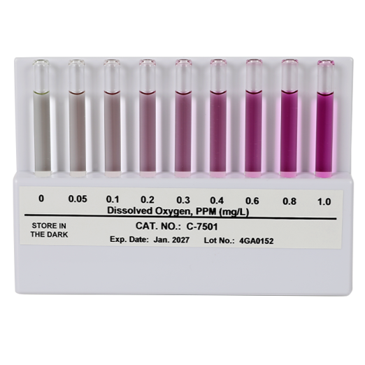 C-7501 Dissolved Oxygen Comparator is a component of K-7501 Dissolved Oxygen CHEMets Visual Test Kit and is designed to be compared against the color formed in R-7501 Dissolved Oxygen CHEMets Refill. The comparator’s range is applicable to many industrial applications. Color standards are pink in color and cover a range of 0-1.0 mg/L Oxygen.