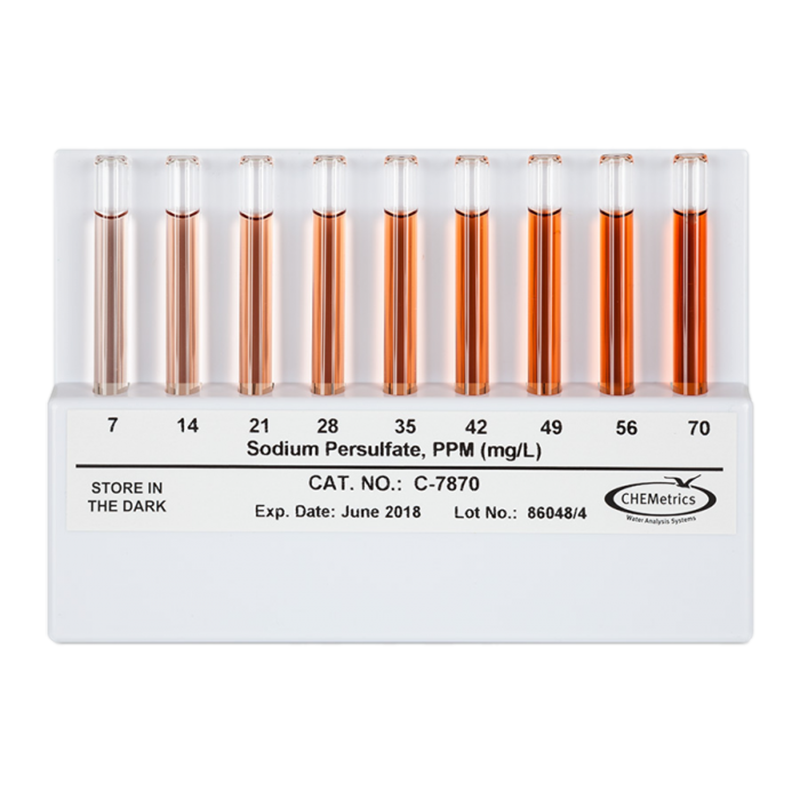 C-7870 High Range Persulfate Comparator is a component of K-7870 Persulfate CHEMets Visual Test Kit and is designed to be compared against the color formed in R-5510 Peroxide/Persulfate CHEMets Refill. The comparator’s range is applicable to many industrial applications. Color standards are orange in color and cover a range of 7-70 ppm sodium persulfate.