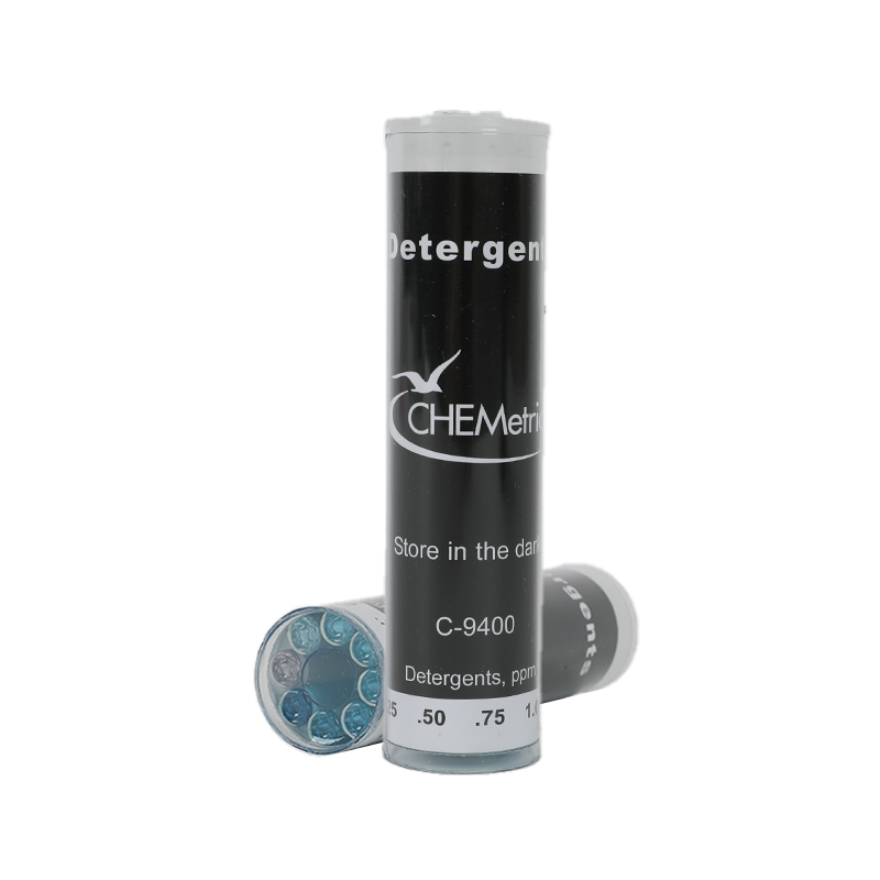C-9400 Detergents Comparator is a component of K-9400 Detergents (anionic surfactants, MBAS) CHEMets Visual Test Kit and is designed to be compared against the color formed in R-9400 Detergents CHEMets Refill. The comparator’s range is applicable to many disinfection and stormwater applications. Color standards are blue in color and cover a range of 0-3.0 ppm linear alkylbenzene sulfonate (LAS).