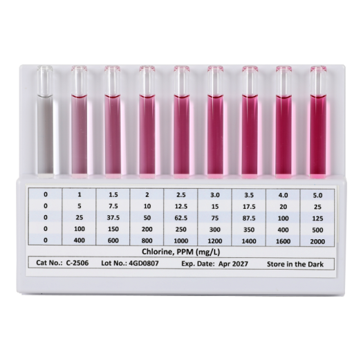 The K-2520B Chlorine HR CHEMets®  Test Kit (0-500 ppm) comes in a plastic case and contains everything needed to perform 30 tests (except distilled water): R-2500 CHEMets®  Refill, C-2506 Comparator, A-2500 Activator Solution, 25 mL sample cup, A-0194 MiniPet®, A-0171 Pipettor Tips Pack, and instructions.