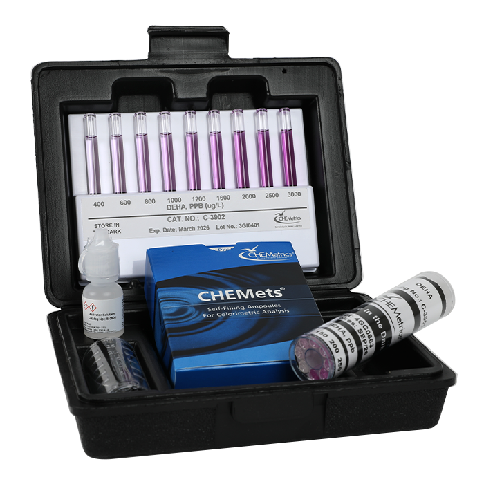 The K-3902 DEHA CHEMets® test kit (0-400 & 400-3000 ppb) comes in a plastic case and contains everything needed to perform 30 tests: Refill (R-3902), Low and High Range Comparators (C-3901 & C-3902), Activator Solution (A-3900), 25 ml sample cup (A-0013), and instructions.