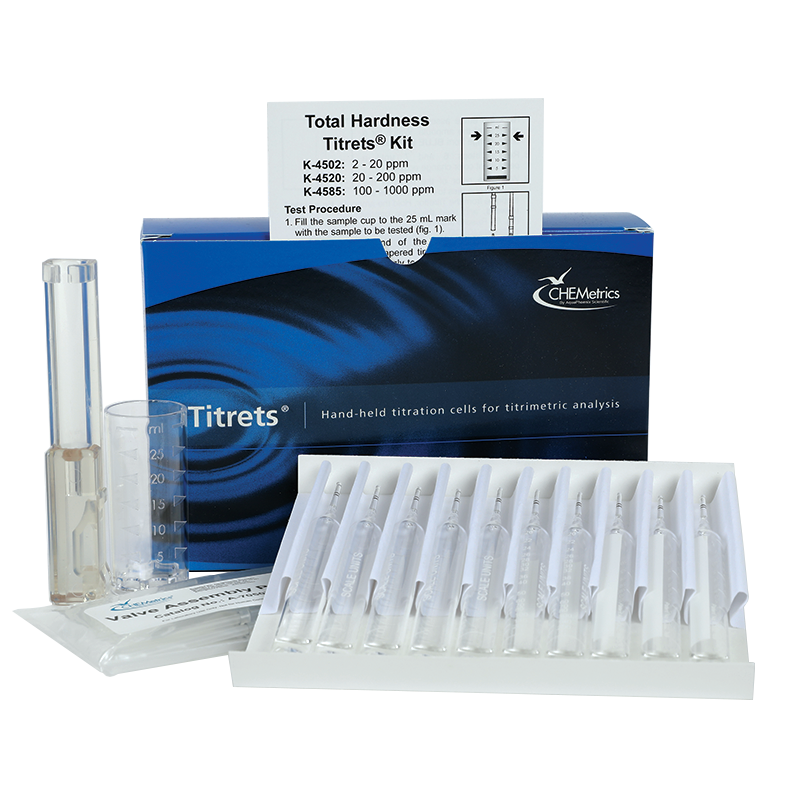 The K-4502 Total Hardness Titrets® Test Kit (2-20 ppm) comes in a cardboard box and contains everything needed to perform 30 tests: thirty Titrets® ampoules with valve assemblies, plastic titrettor, 25 mL sample cup, and instructions. This kit uses the EDTA chemistry to measure the hardness of water by measuring the dissolved minerals in the water. Results are reported in ppm as CaCO3