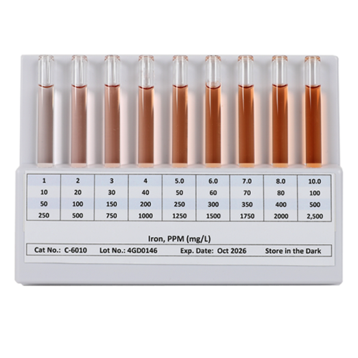 The K-6020B Iron (total & soluble) HR CHEMets® Test Kit (250-2500 ppm) comes in a plastic case and contains everything needed to perform 30 tests (except distilled water): HR CHEMets® Refill, Flat Comparator, 25 mL sample cup, pipettor tips, 100 uL fixed volume pipet, iron activator solution, and instructions.