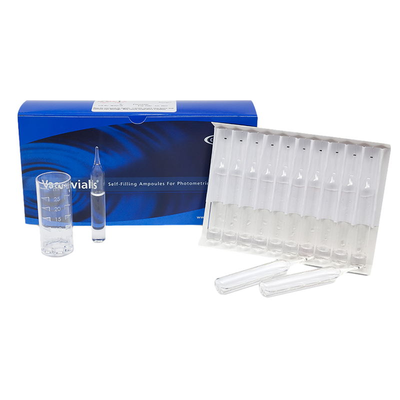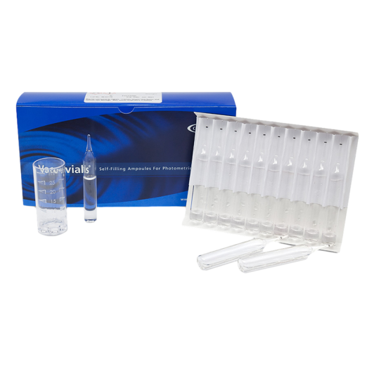 Kit comes in a cardboard box and contains everything needed to perform 30 tests: thirty ampoules, 25 mL sample cup, ampoule blank, and instructions.