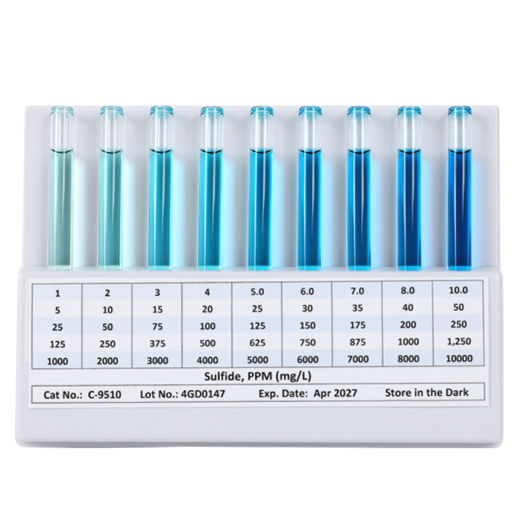 The K-9520B Sulfide HR CHEMets® Test Kit (125-1250 ppm) comes in a plastic case and contains everything needed to perform 30 tests (except distilled water): HR CHEMets® Refill, Flat Comparator, 25 mL sample cup, sample cup top, 200 uL fixed volume pipet, pipettor tips, sulfide activator solution, and instructions.