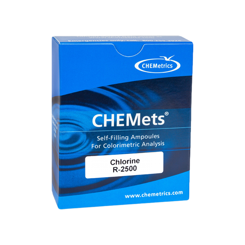 The CHEMets® R-2500 Refill is a direct replacement for several legacy products and is compatible with a wide range of chlorine and chlorine dioxide visual test kits. Designed for use with K-2504, K-2504A, K-2504B, K-2504C, and K-2504D Chlorine Test Kits, this refill can also be used with K-5808 and K-5816 Chlorine Dioxide Test Kits when paired with Accessory Pack A-0171. It contains 30 self-filling CHEMets ampoules, securely packaged in cardboard trays and a protective box.