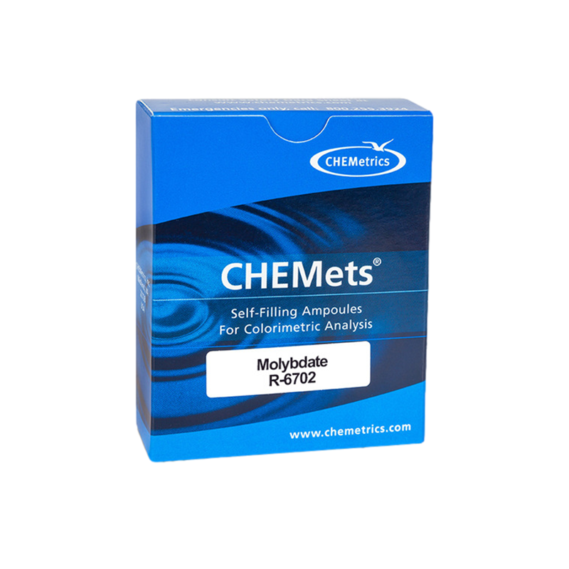 The CHEMets® R-6702 Molybdate Refill is intended for use with the K-6701 and K-6702 Visual Test Kits to measure molybdate concentrations in water using the Catechol method. This refill includes 30 self-filling ampoules, securely packaged in cardboard trays and a protective box to ensure safe handling and storage. It is compatible with both the C-6701 and C-6702 Molybdate Comparators, supporting consistent results across a variety of water quality monitoring environments.