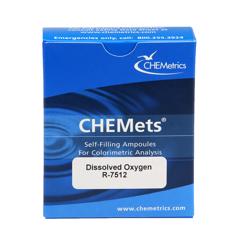 The R-7512 Dissolved Oxygen CHEMets® Refill is designed for use with the K-7512 Visual Test Kit to measure dissolved oxygen levels in water using the Indigo Carmine Method. This refill includes 30 self-filling ampoules, securely packaged in cardboard trays and a durable box for safe storage and transport. It is fully compatible with the C-7512 Dissolved Oxygen Comparator, ensuring reliable colorimetric analysis.
