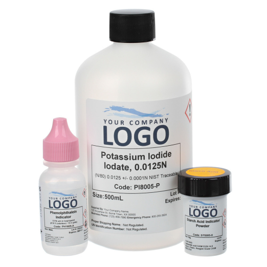 Sulfite Reagent Set, 1 mL = 10 ppm as SO3 / 50 mL, Set Includes: 1x Potassium Iodide-Iodate 0.0125N (N/80), 500 mL, 1x Phenolphthalein Indicator, 30 mL, 1x Starch Acid Powder, 10 g