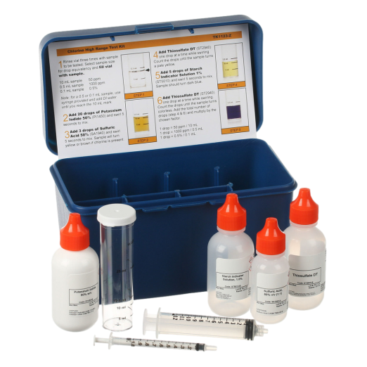 The EndPoint ID® HR Chlorine Test Kit test kit comes in a plastic case and contains everything needed to perform approximately 60-75 tests. Color coded reagent caps match the color bar on the instruction card for easy identification when running multiple tests and our photographic, step-by-step instructions keep testing simple and help users easily identify color changes.