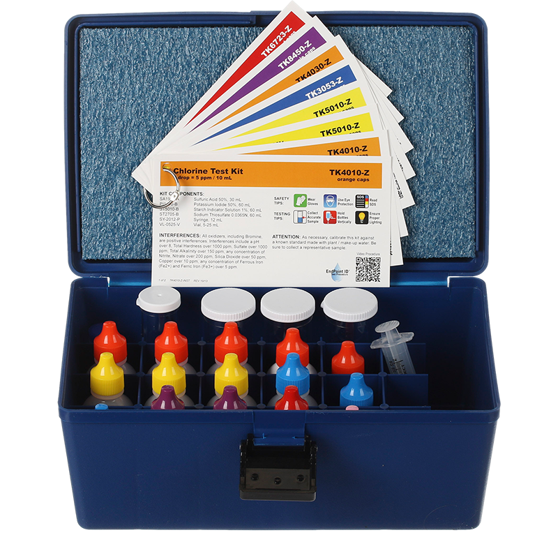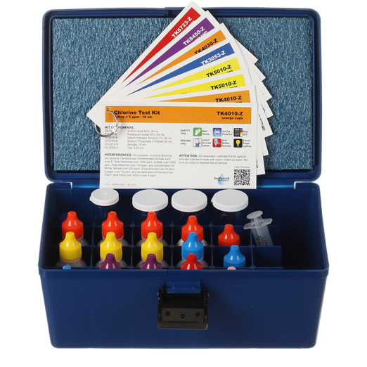 Contains: Chlorinated Alkaline/Total Alkalinity Test Kit, Total Hardness Test Kit, Hydrogen Peroxide Test Kit, Chlorine Test Kit, Chlorine OTO Residual Test Kit, Iron Residual Test Kit, Test for Final Fabric pH - Sour Tester, 1-12 pH Test Strips, Vial 10-50 mL, Syringe 12 mL
