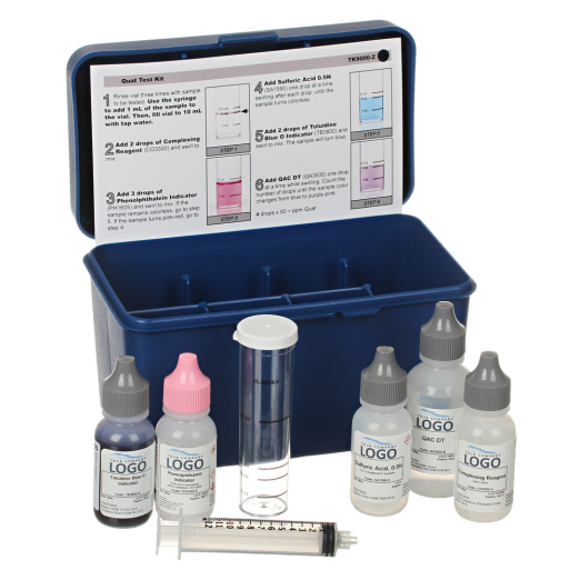 Our quat test kit is used to verify the concentration levels of quat sanitizers used in the cleaning and sanitation industry. It can be used to test concentration levels for hard surface sanitizing, foot baths, hand dips and environmental sanitizing. Concentration levels are represented in ppm. EndPoint IDĀ® test kits and reagents can be private labeled with your company logo and contact information to help build your brand. Each kit is packaged in a durable plastic case and includes all items to complete approximately 60-75 tests.